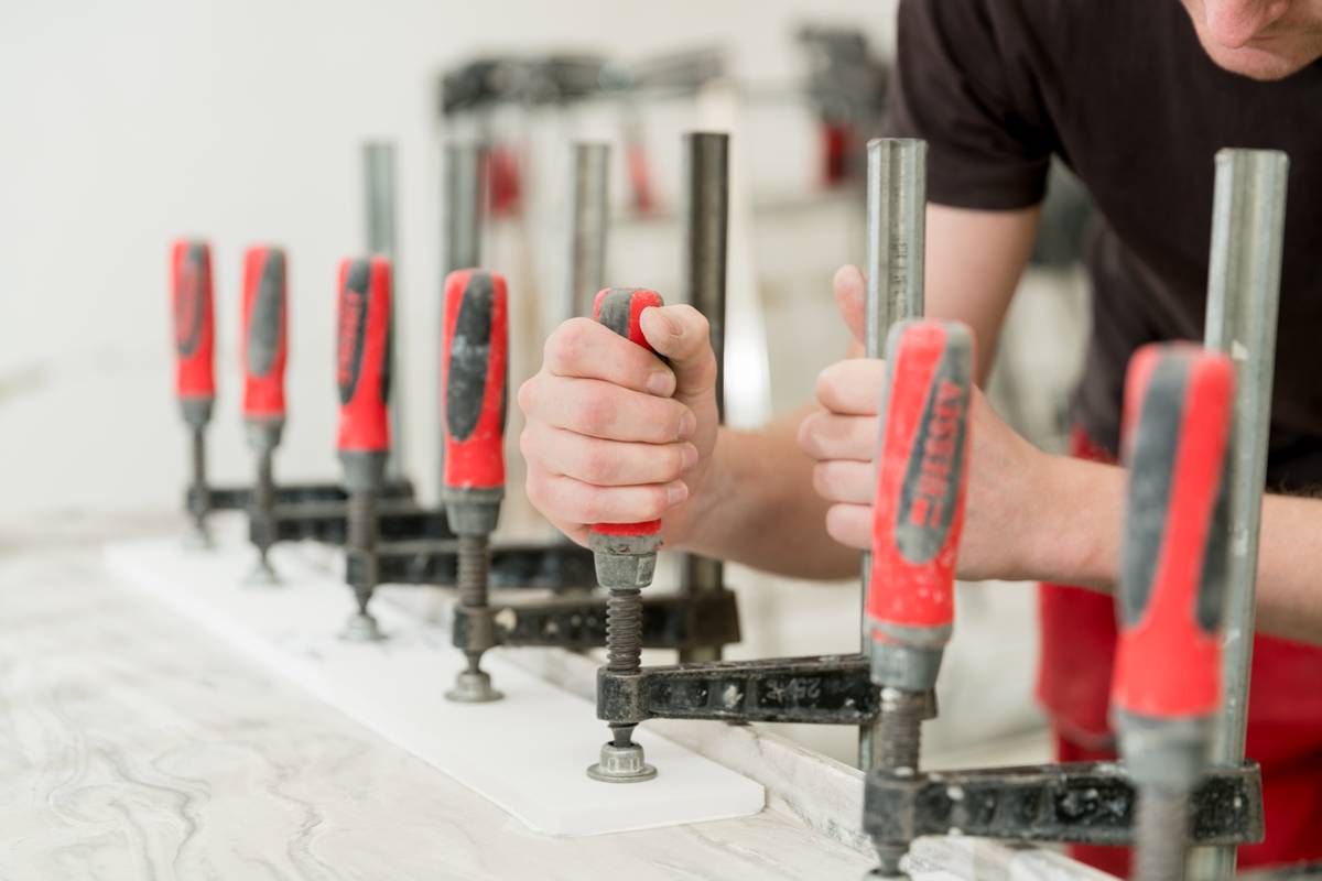 После раскроя каменной плиты все элементы склеивают в единую конструкцию